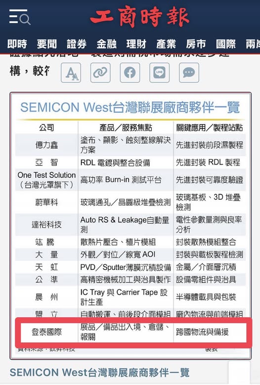 登泰國際物流榮幸參與SEMICON West 台灣聯展 前へ 次へ 【登泰國際物流榮幸參與SEMICON West 台灣聯展,助攻半導體供應鏈拓展北美市場】台灣半導體供應鏈再度出擊北美! 由鈦昇號召, 12家台廠聯手參加美國 SEMICON West 展會,主打一站式先進封裝整合服務。 登泰國際物流有榮幸參與此次「台灣聯展」, 提供北美在地物流支援, 協助夥伴穩定出貨、快速佈局。